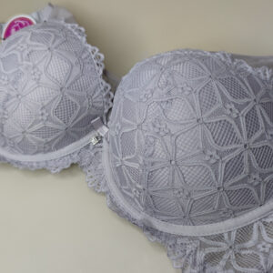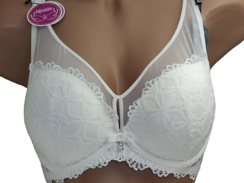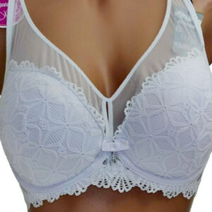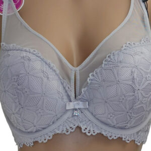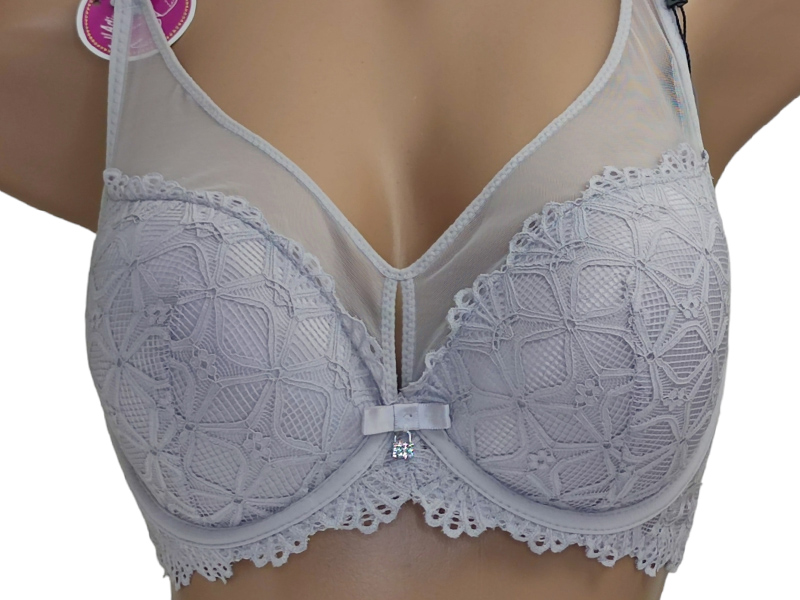 Бюстгальтер на щільній і повномірній чашці, виконаний з мережива квіткового візерунка, з акцентом на продовженні чашечки, виконаної з дрібної щільної сіточки.