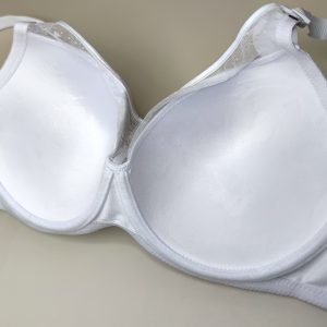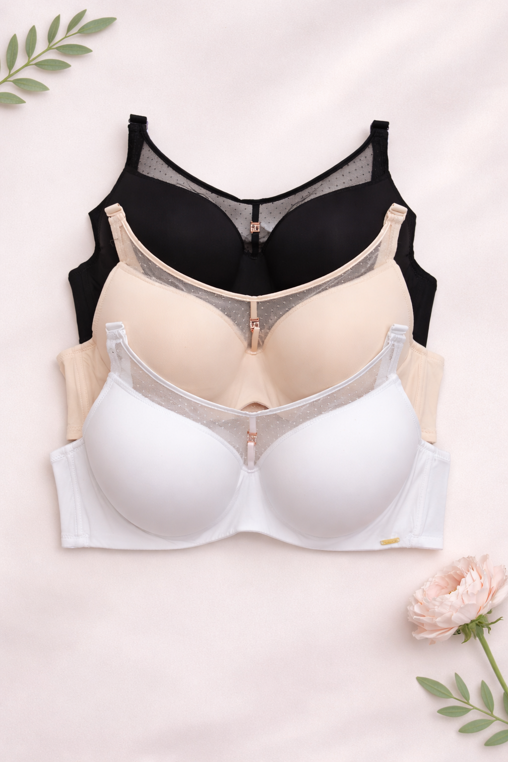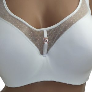 Бюстгальтер у лаконічному дизайні на щільній тонкій та повномірній чашці Е. Виконаний з мікрофібри, з акцентом на продовженні чашечки із щільної ніжної сіточки.