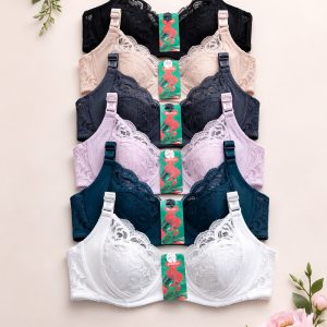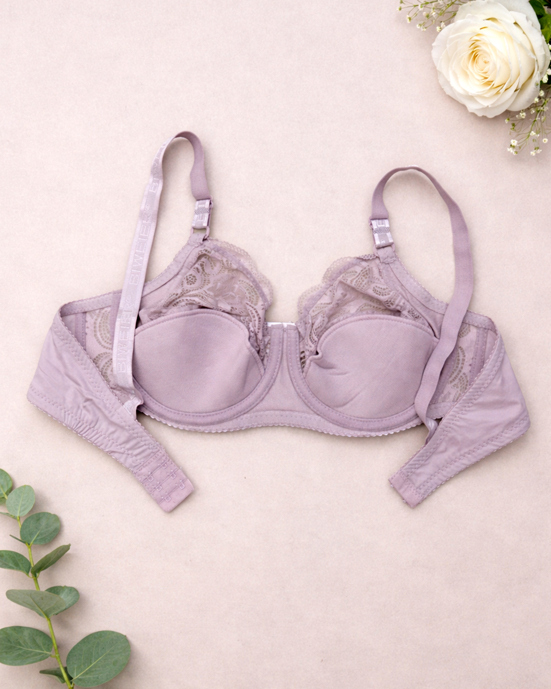 Бюстгальтер на м’якій чашці повномірного розміру С. Чашка виконана з м’якого мережива квіткового, має бавовняну поролонову вставку. Пояс бюстгальтера виконаний із еластичної мікрофібри.
