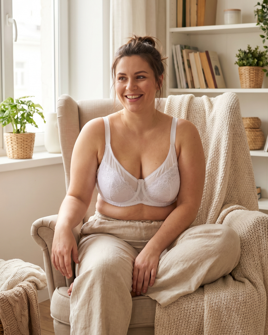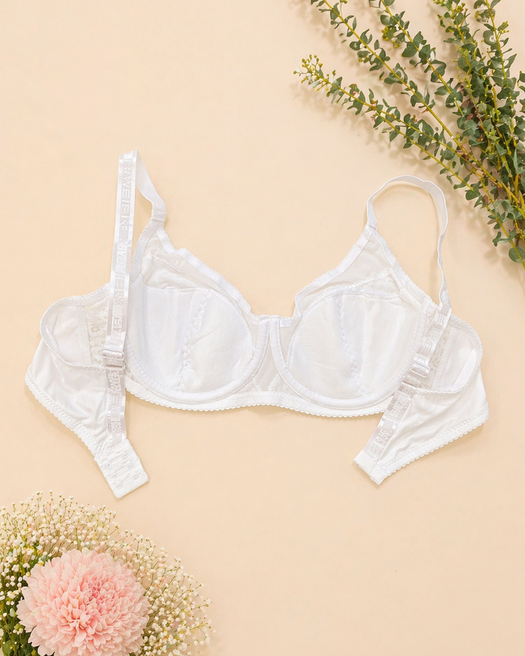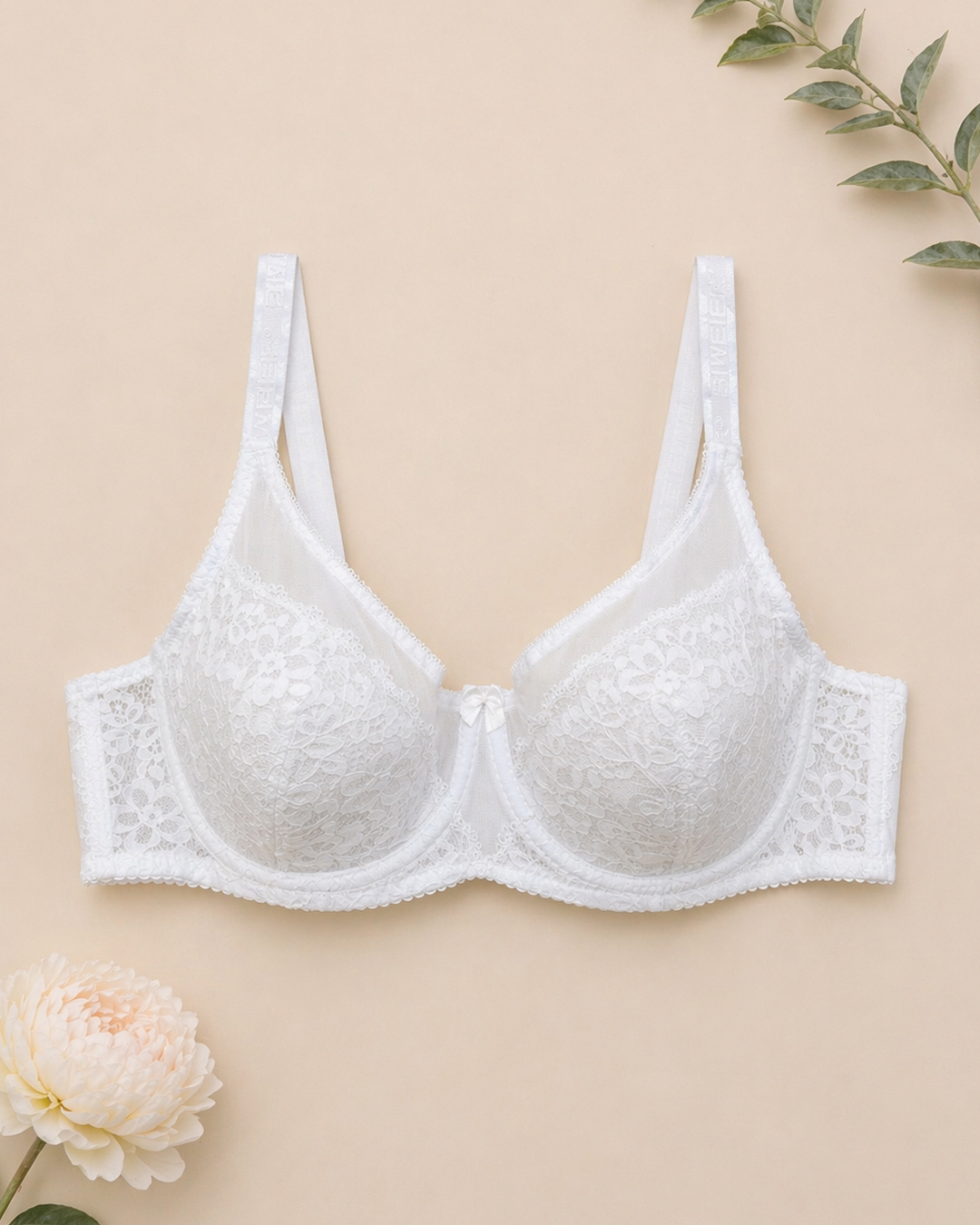 Бюстгальтер на м’якій чашці розміру F. Чашка виконана з м’якого квіткового мережива та м’якої пружної сіточки, має бавовняну поролонову вставку. Пояс бюстгальтера виконаний із еластичної мікрофібри. Широкі незнімні регульовані бретельки та застібка ззаду на два гачки з трьома позиціями регулювання.