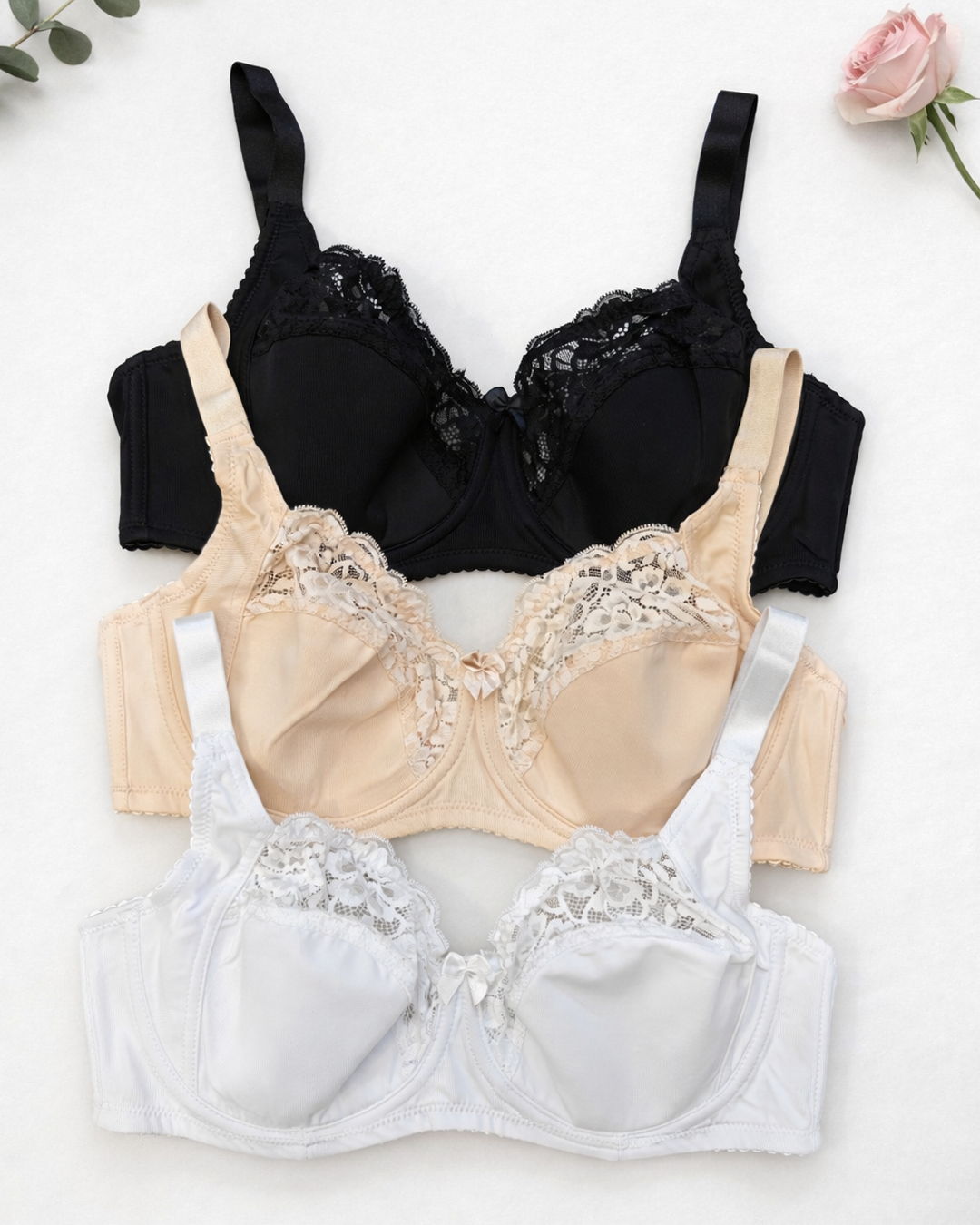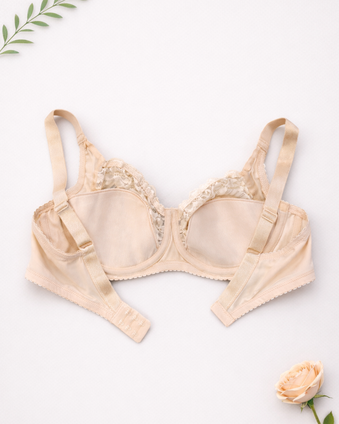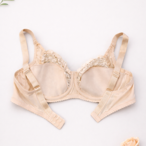 Бюстгальтер на м’якій чашці розміру D. Низ чашки – мікрофібра, що має бавовняну поролонову вставку. Верхня частина чашки виконана з м’якого квіткового мережива.