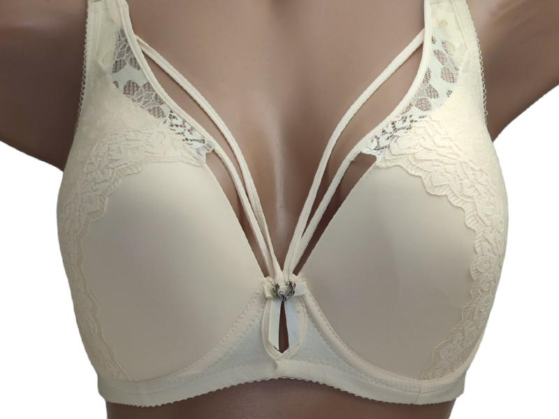 Бюстгальтер на щільній гладкій чашці розміру D. Чашки бюстгальтера доповнені коректором, що дозволяє красиво підняти і сформувати груди. Чудове мереживо, з якого доповнена частина бра, надає моделі ще більшої ошатності. Але абсолютної чарівності ця модель досягає за рахунок елегантного і лаконічного дизайнерського рішення у вигляді тонких шлейок портупеї: завдяки їм бра стає, буквально, обов’язковим атрибутом практично будь-якого ошатного образу, а особливо образа з відкритим декольте. Знімна бретель. Дуже зручна і елегантно-ошатна модель.
