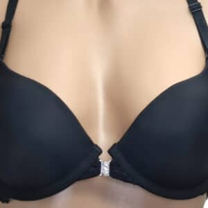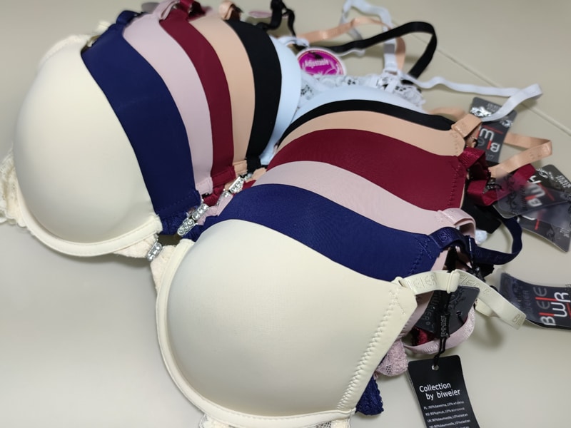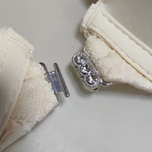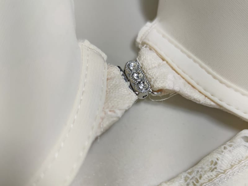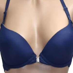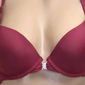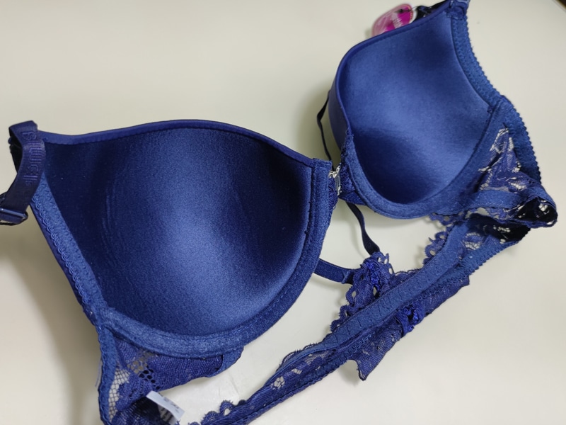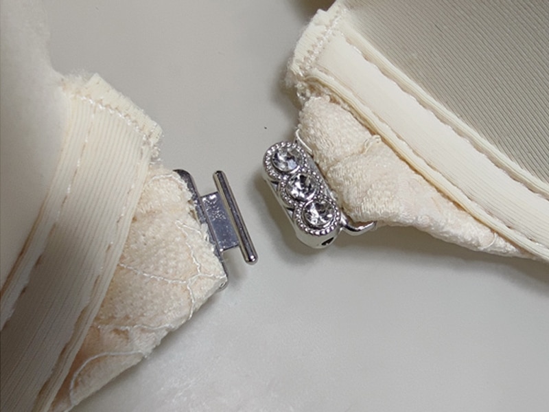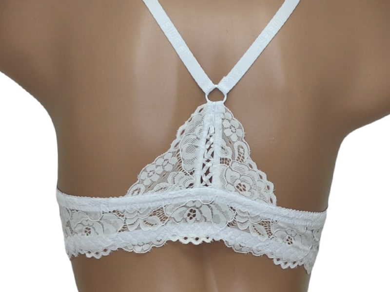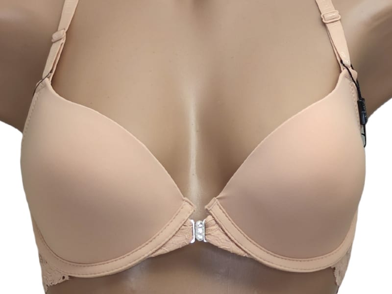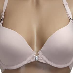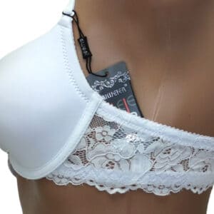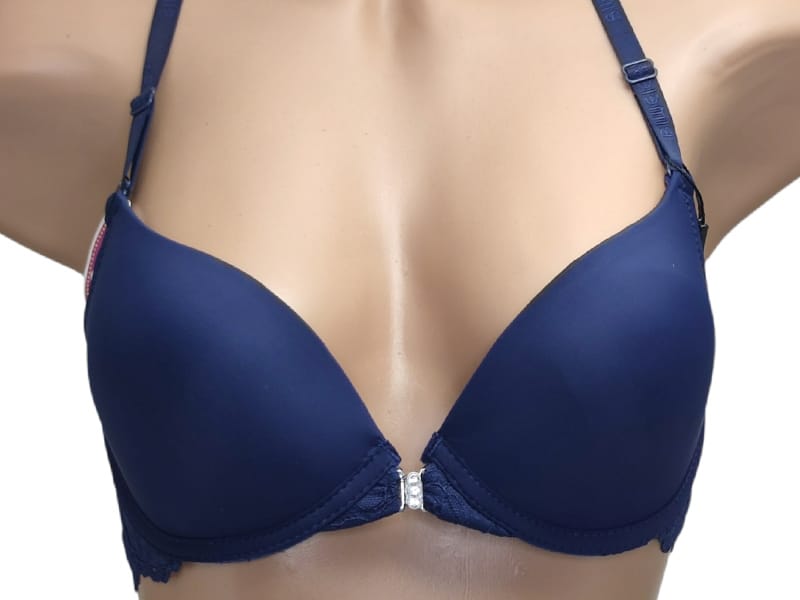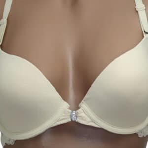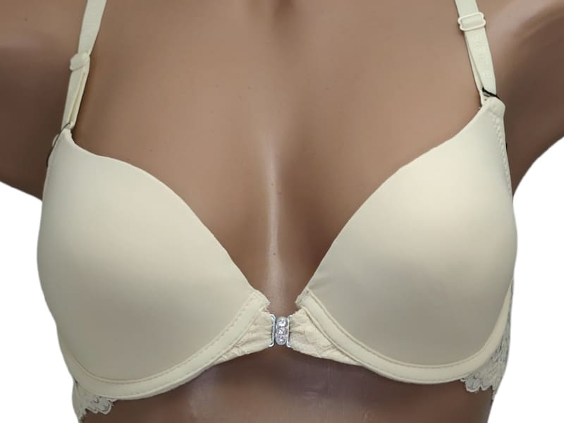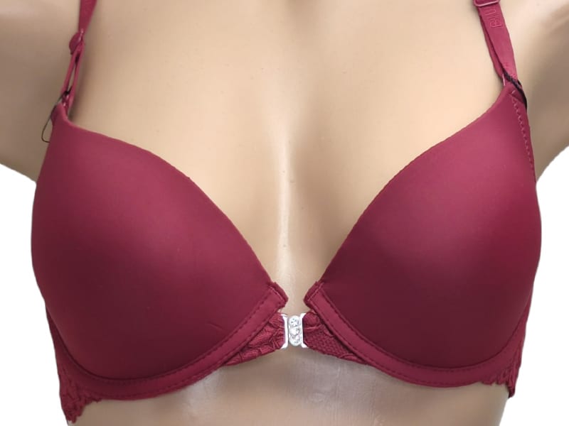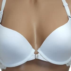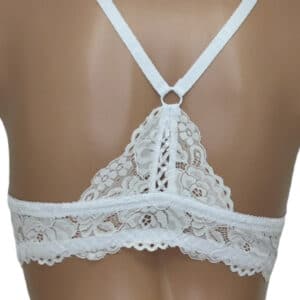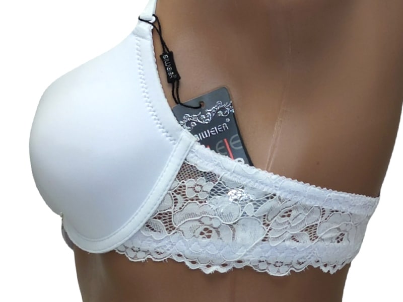 Бюстгальтер гладкий на тонкому поролоні в чашці В. Спереду модель прикрашена брошкою, що розстібається. Суцільна ажурна спинка з незвичайним розташуванням бретелей.