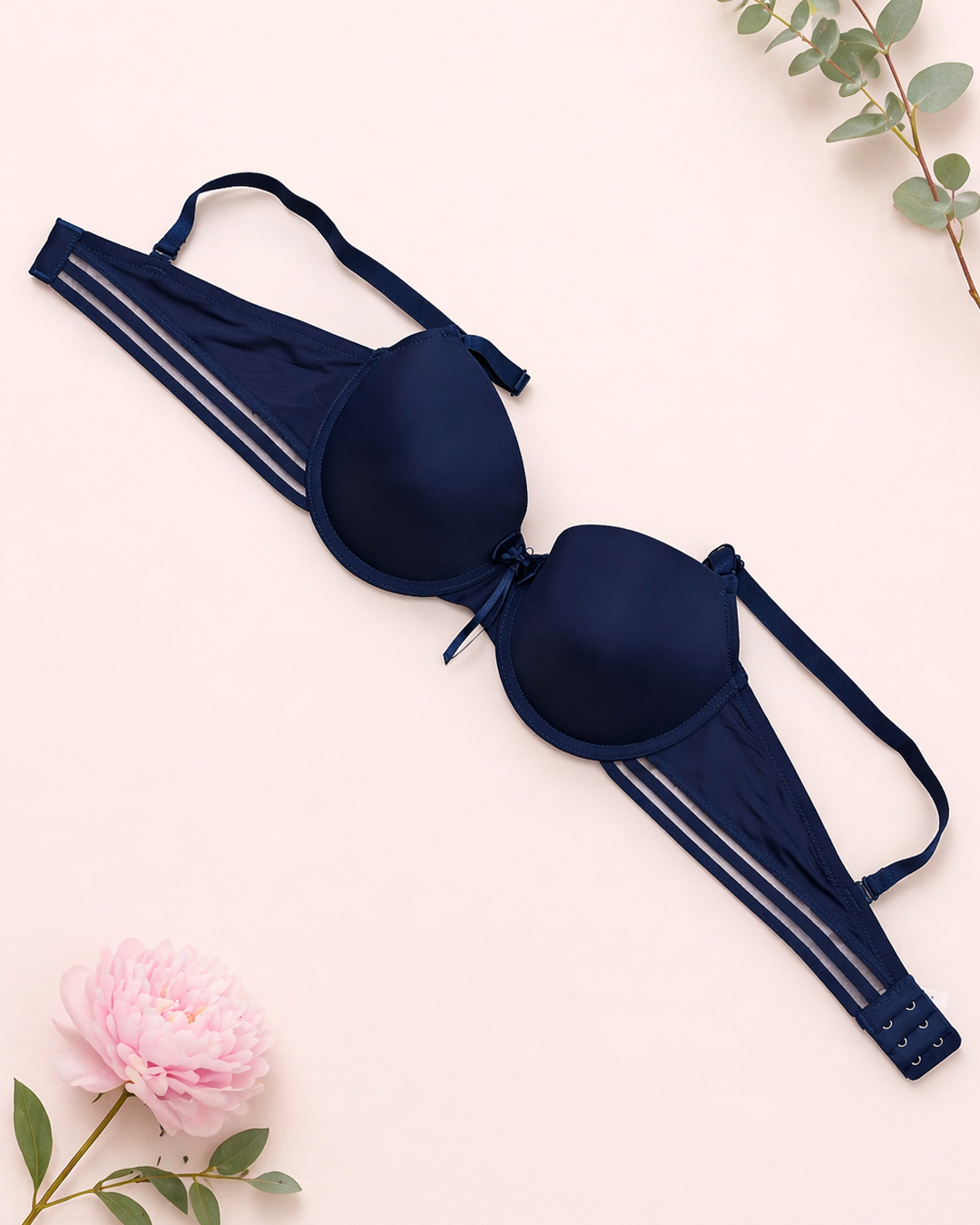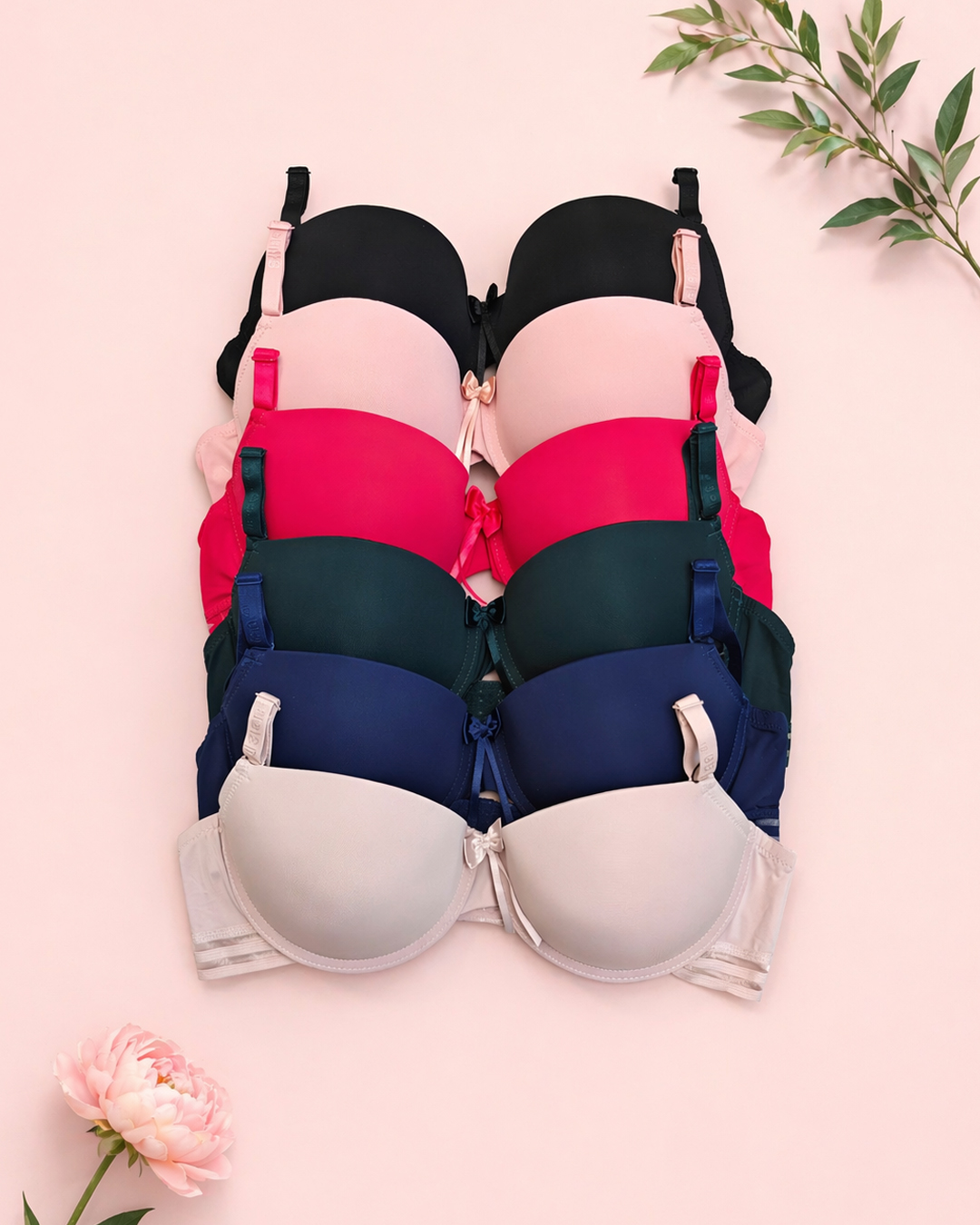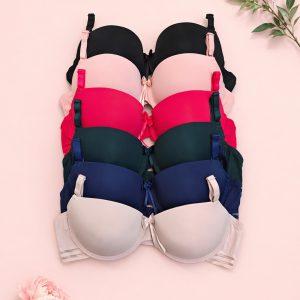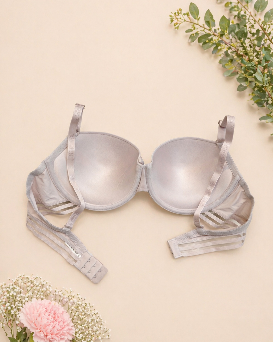 Формовані чашки ідеально облягають груди, а каркасна конструкція забезпечує надійну підтримку протягом дня. Знімні регульовані бретелі та застібка ззаду на два гачки з трьома позиціями регулювання.