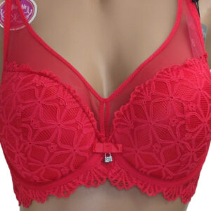 Бюстгальтер на щільній і повномірній чашці С, виконаний з мережива квіткового візерунка, з акцентом на продовженні чашечки, виконаної з дрібної щільної сіточки.