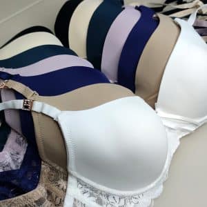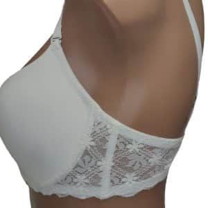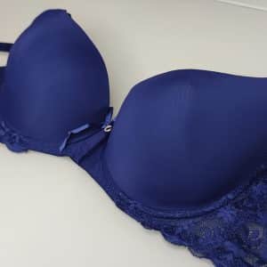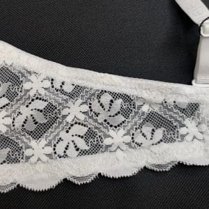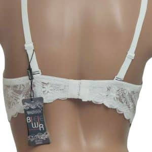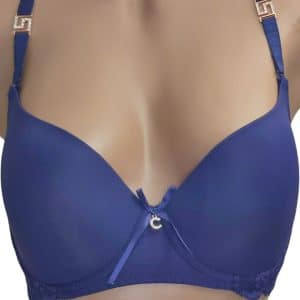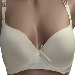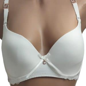 Бюстгальтер, повномірна чашка С, гладкий на тонкому м’якому поролоні. Спинка декорована мереживом. Знімні та регульовані бретелі, декоровані брошкою. Застібка ззаду на два гачки з чотирма позиціями регулювання.