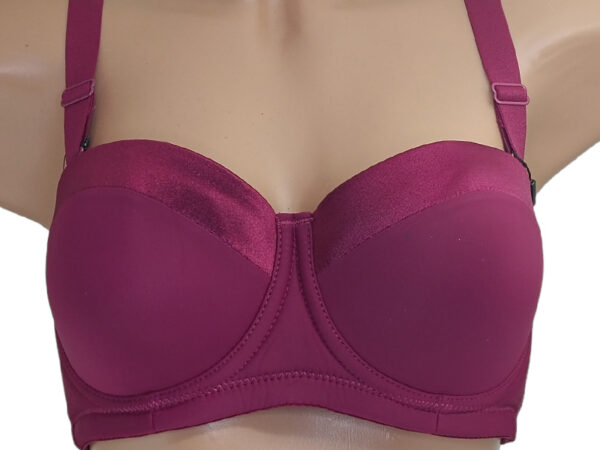 Гладкий балконет на щільній чашці розміру D. Бра виконаний з ніжної мікрофібри, зверху чашки декоровані атласною стрічкою. Зручна модель, добре тримає груди. Для запобігання сповзанню внутрішні шви спинки та чашок бюстгальтера доповнені силіконом (дивіться фото). Застібка на три гачки. Знімна бретель.