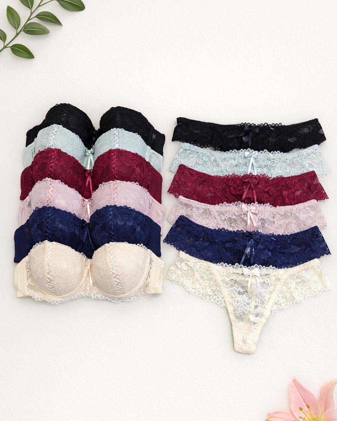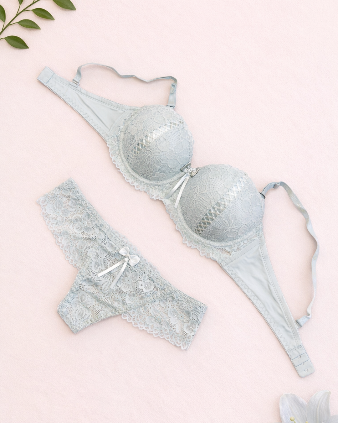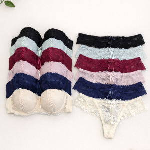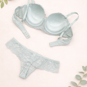 Вишуканий комплект складається з ажурного бюстгальтера-балконет (“анжеліка”) у чашці В та ажурних стрінгів.