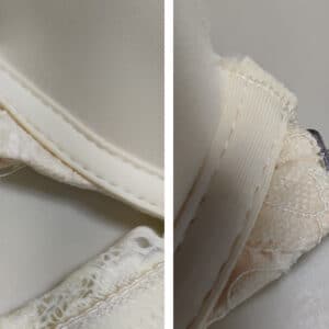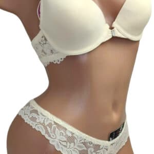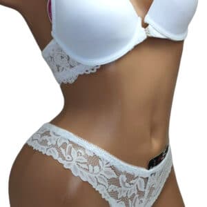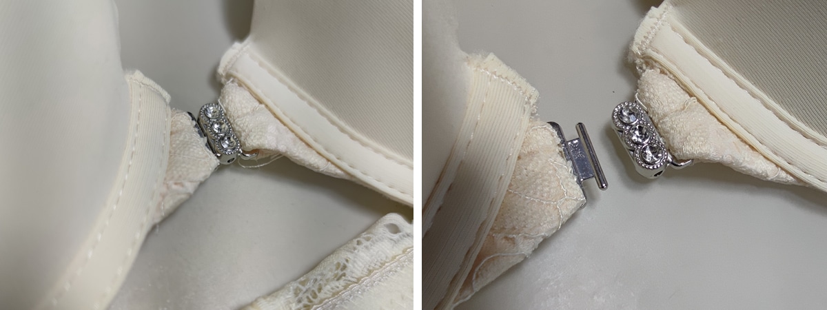Спереду модель прикрашена брошкою, що розстібається. Суцільна ажурна спинка з незвичайним розташуванням бретелей.