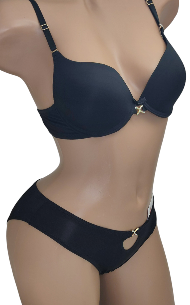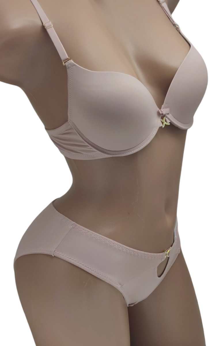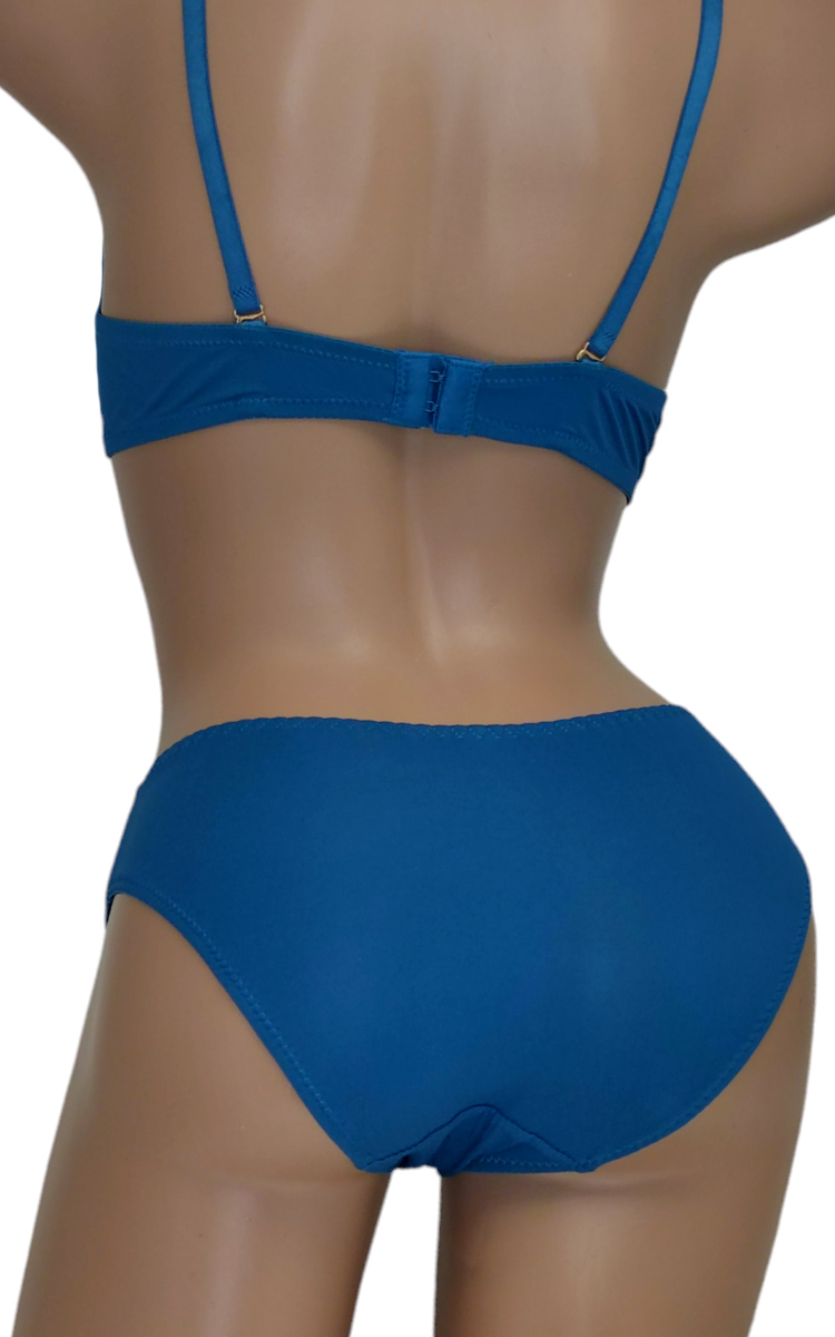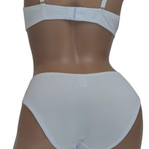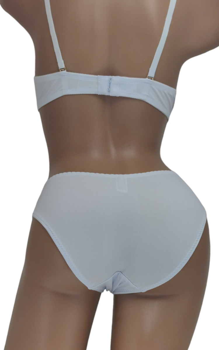 Комплект: відкритий бюстгальтер на щільній, тонкій чашці розміру В і трусики-сліпи. Виготовлений із ніжної мікрофібри. Бра і трусики прикрашені невеликою брошкою, що робить комплект ще більш ошатним. Знімні, регульовані бретелі та застібка ззаду на два гачки з чотирма позиціями регулювання.