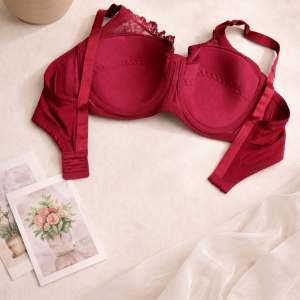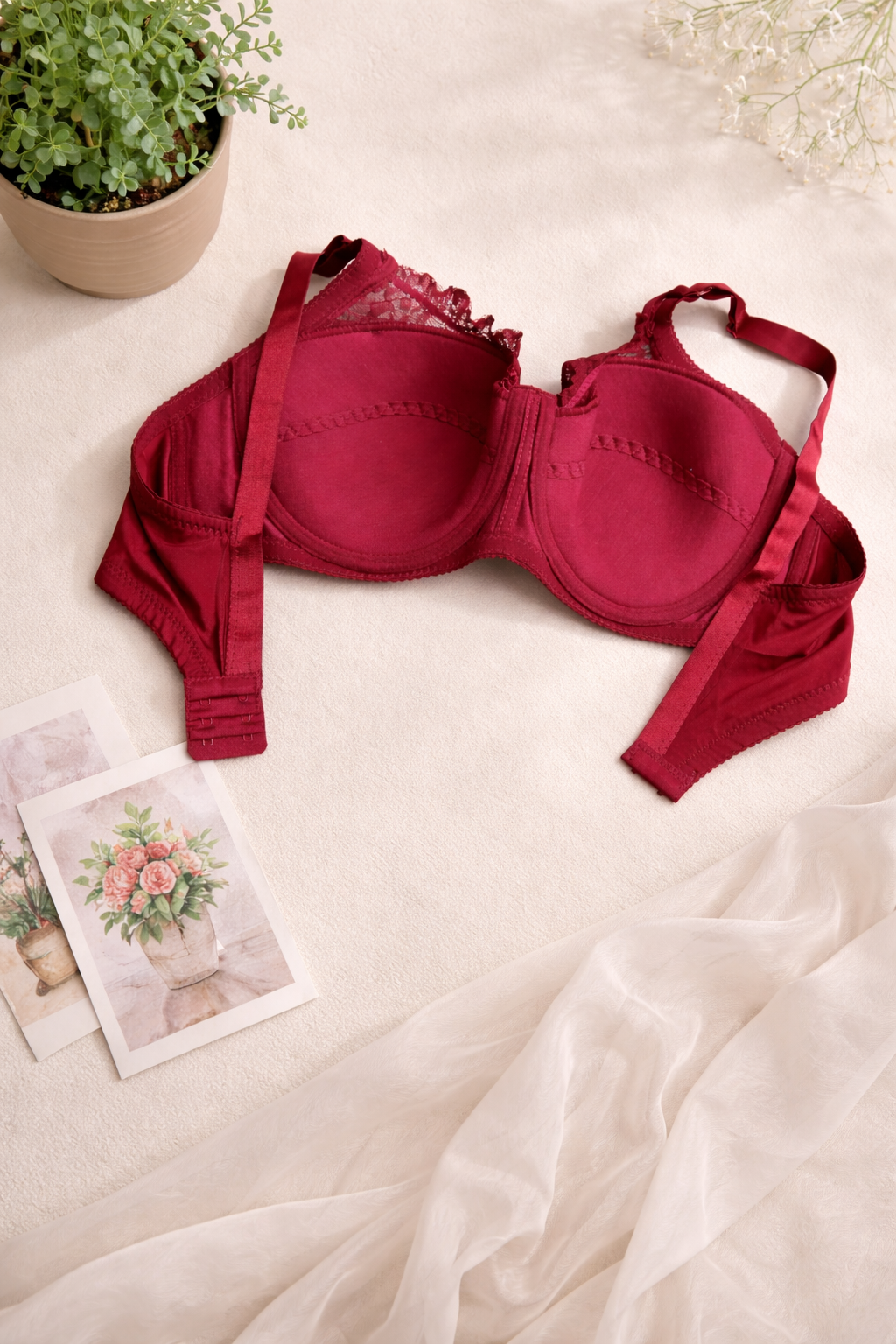Бюстгальтер на мягкой чашке размера DD. Чашка выполнена из мягкого цветочного кружева, имеет хлопковую поролоновую вставку. Пояс бюстгальтера выполнен из эластичной микрофибры. Широкие несъёмные бретельки и застёжка сзади на два крючка с тремя позициями регулирования.