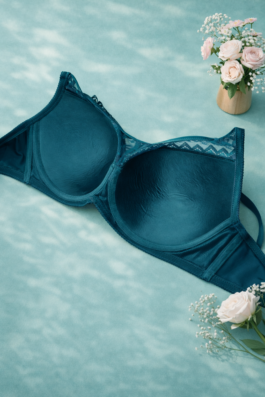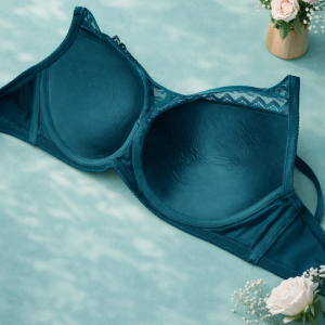 Бюстгальтер на плотной тонкой и полномерной чашке D, выполнен из кружева цветочного узора, с акцентом на продлении чашечки, выполненной из мелкой плотной сеточки.